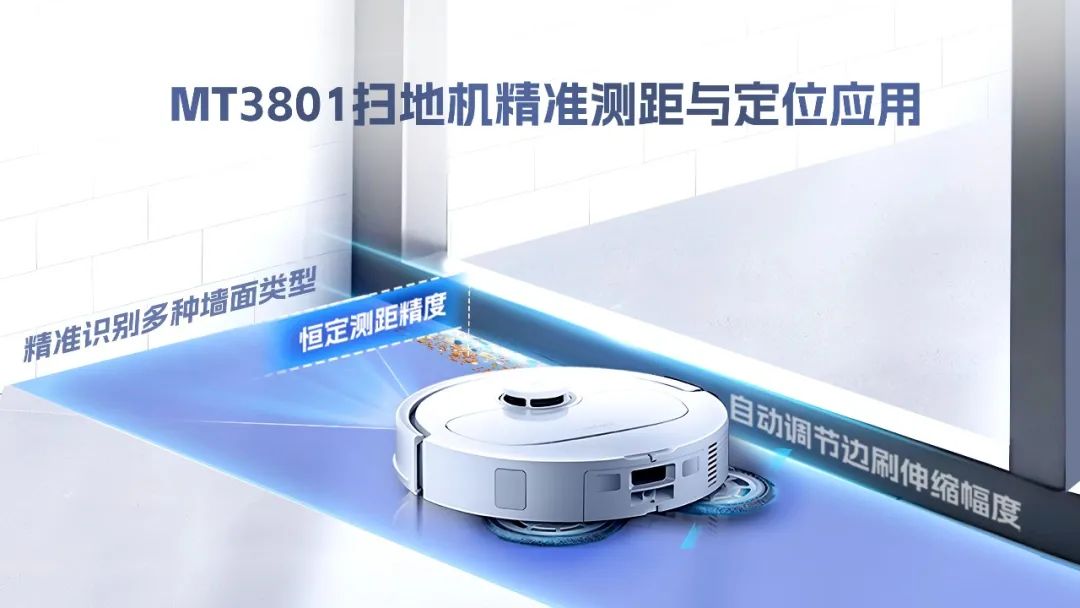 DTOF傳感器在沿墻模式下保持恒定測距精度,確保邊刷與墻面始終維持最佳間距,實現(xiàn)極限貼邊。同時,基于實時距離反饋,系統(tǒng)自動調(diào)節(jié)邊刷伸縮幅度,將墻角垃圾精準掃入主吸塵通道,還可精準識別多種墻面類型(如踢腳線、玻璃幕墻、凹凸磚墻等),并自動調(diào)整清潔策略。(點擊查看更多MT3801產(chǎn)品信息