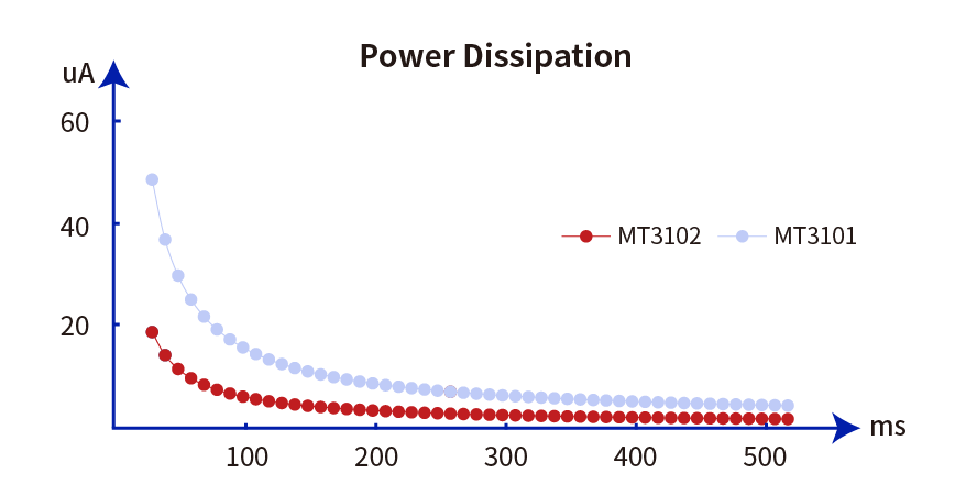 擁有業(yè)內(nèi)領(lǐng)先的平均使用功耗水平,包含運(yùn)行/待機(jī)/睡眠電流。其中,待機(jī)/休眠功耗0.7uA、工作電流低于10uA@100ms(包含VCSEL功耗)。MT3102功耗與前代MT3101相比大幅下降。