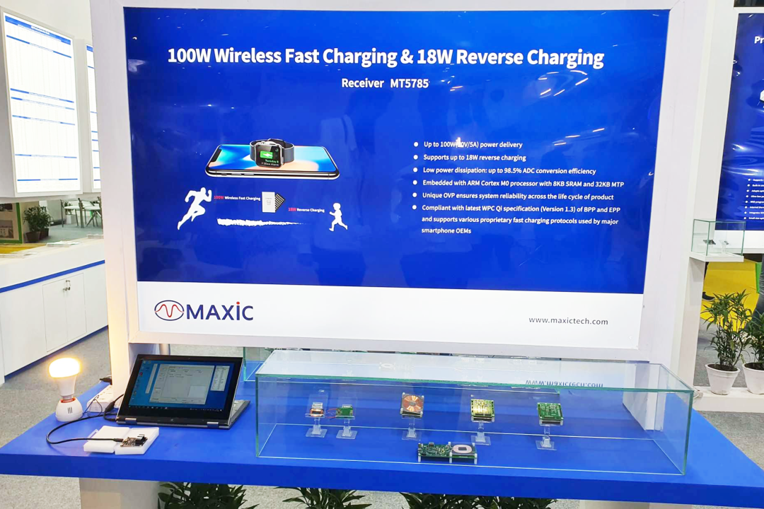 The wireless charging exhibition area exhibited wireless power receivers, represented by MT5785 that supports 100W wireless fast charging and 18W reverse charging, and transmitters represented by MT5815 that supports USB-PD protocol. A large number of visitors came and had deep discussion with Maxic personnel.