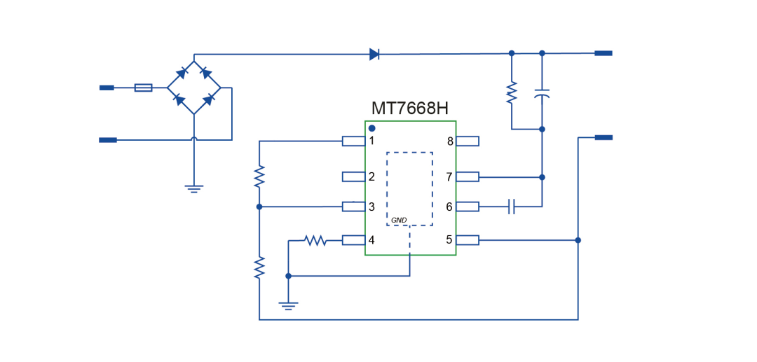 Meanwhile, MT7668H integrates high voltage power MOS and high voltage power supply circuit, no magnetic components are required, such as inductor and transformer, and has simple peripheral circuit.