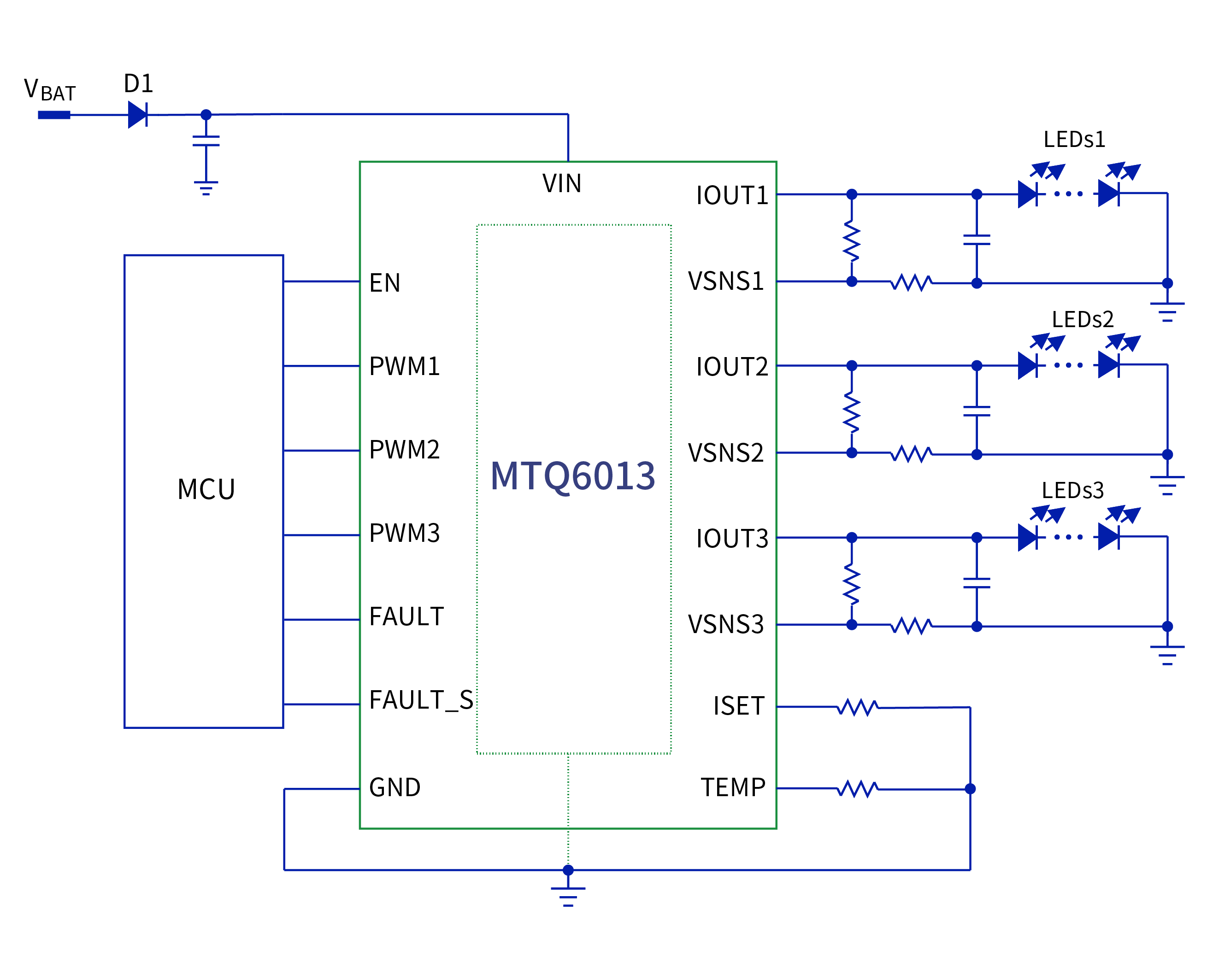 MTQ6013 provides complete diagnosis functions to meet automotive-grade requirements. It has two fault pins: FAULT pin and FAULT_S pin. FAULT_S pin is a dedicated fault pin for single-LED short circuit fault and FAULT pin is for general faults, i.e., short circuit, load open, and thermal shutdown, making the chip meet various application requirements.