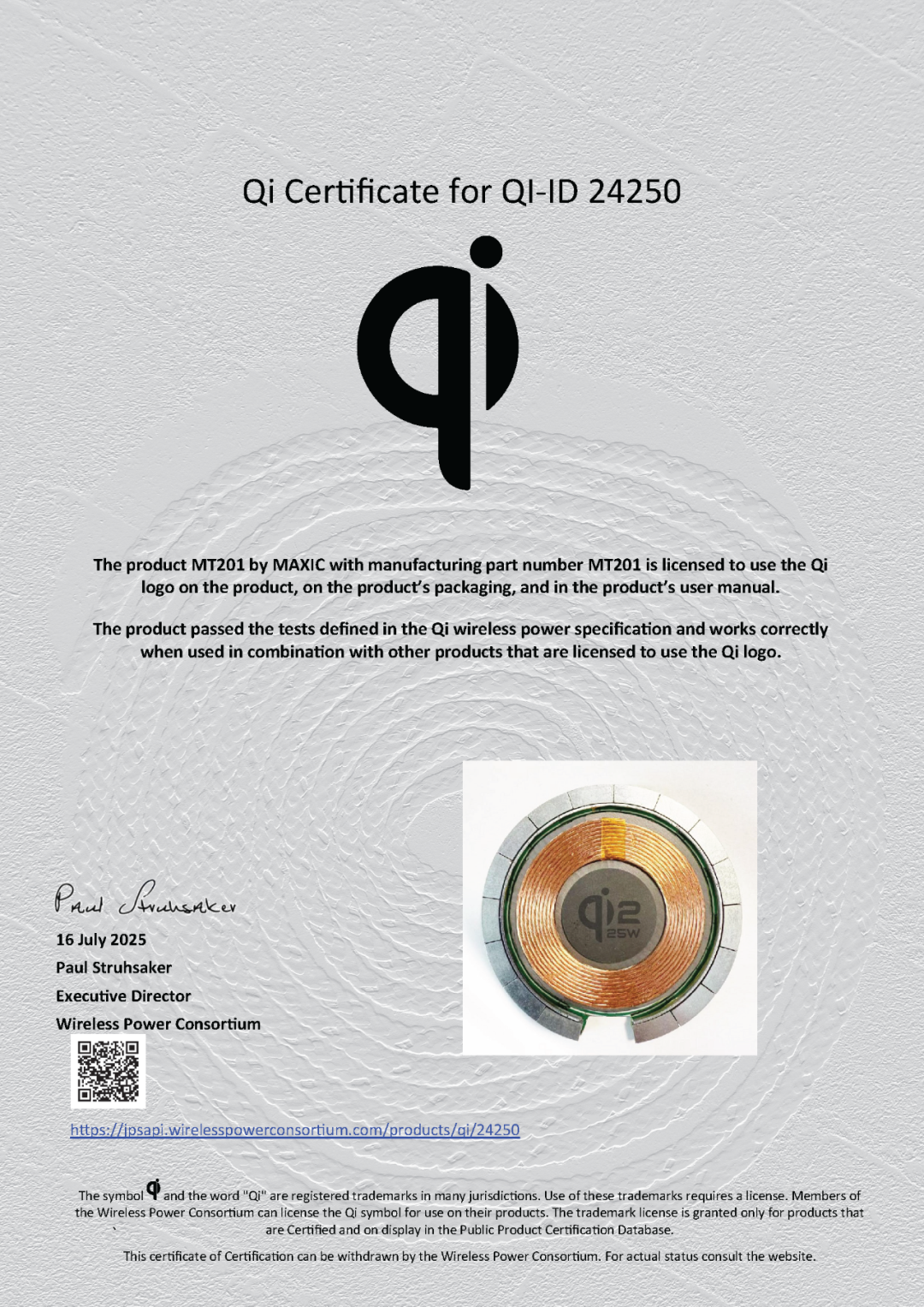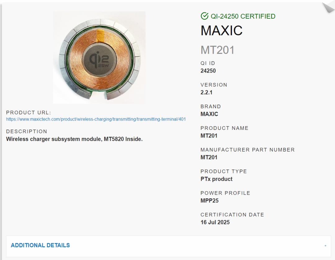 美芯晟自主研發(fā)的無線充電發(fā)射端模組已通過最新的Qi2.2.1認(rèn)證,Qi認(rèn)證ID為24250,料號(hào)為MT201,Qi無線充電功率達(dá)25W(MPP25),內(nèi)置美芯晟一芯多充無線充電發(fā)射端芯片MT5820,支持BPP、EPP和MPP(5W/15W/25W)三種功率配置。