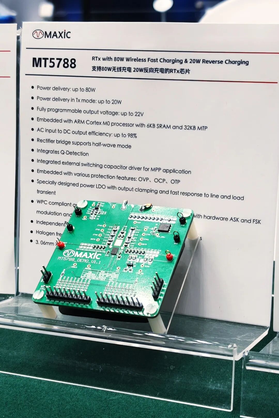 在無線充電接收端,重點展示了高度集成、高功率密度的36W無線充電RTX 芯片MT5708和高集成高效率支持BPP/EPP/MPP的100W無線充電RTX芯片MT5788。