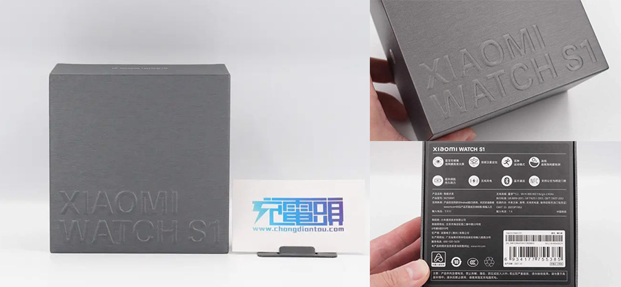 產(chǎn)品包裝盒趨于立方體,整體為灰色基調(diào),棱角分明,風格簡約。包裝盒頂部壓印產(chǎn)品名稱——XIAOMI WATCH S1。包裝盒天地蓋設計,底部貼有產(chǎn)品銘牌,印有產(chǎn)品8大賣點、參數(shù)以及商家信息等,生產(chǎn)商為龍旗電子(惠州)有限公司,產(chǎn)品還通過了CCC認證。