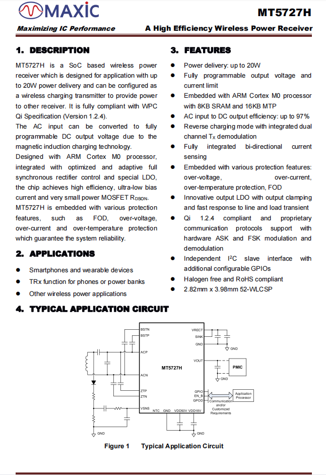 MT5727H內(nèi)置ARM M0處理器,搭配8KB SRAM和16KB MTP存儲器,支持私有無線充電協(xié)議,芯片內(nèi)部集成同步整流器和LDO,芯片內(nèi)置過壓過流保護,支持I2C接口和可配置的GPIO接口。