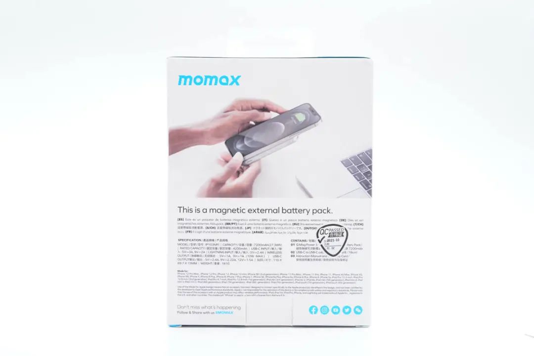 包裝盒正面印有MOMAX品牌、符合國標標識、產(chǎn)品外觀名稱以及MFi認證標識等。
