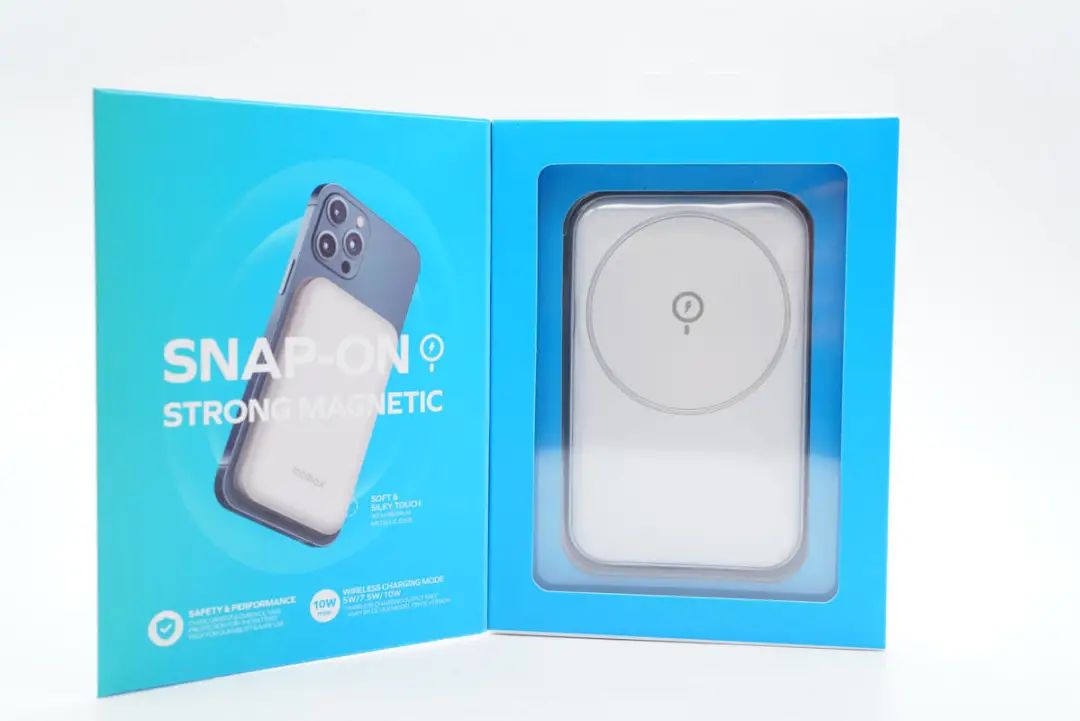 包裝盒書本式設計,封面另一面印有產(chǎn)品使用場景圖,透過櫥窗可見充電寶實體,展示效果好。