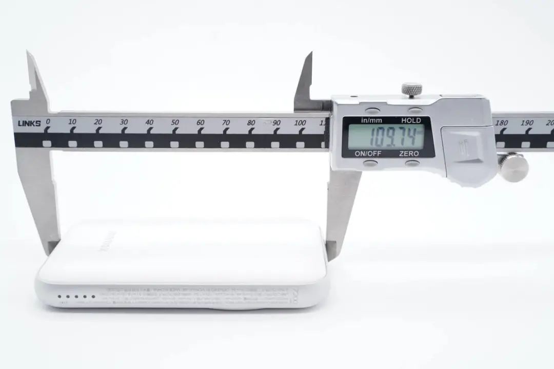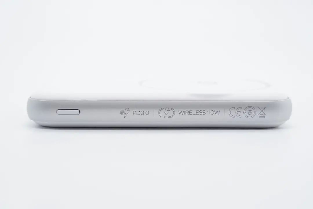 側(cè)面設有電源鍵,金屬殼上鐳雕PD3.0無線充標識,充電寶通過了CE認證。