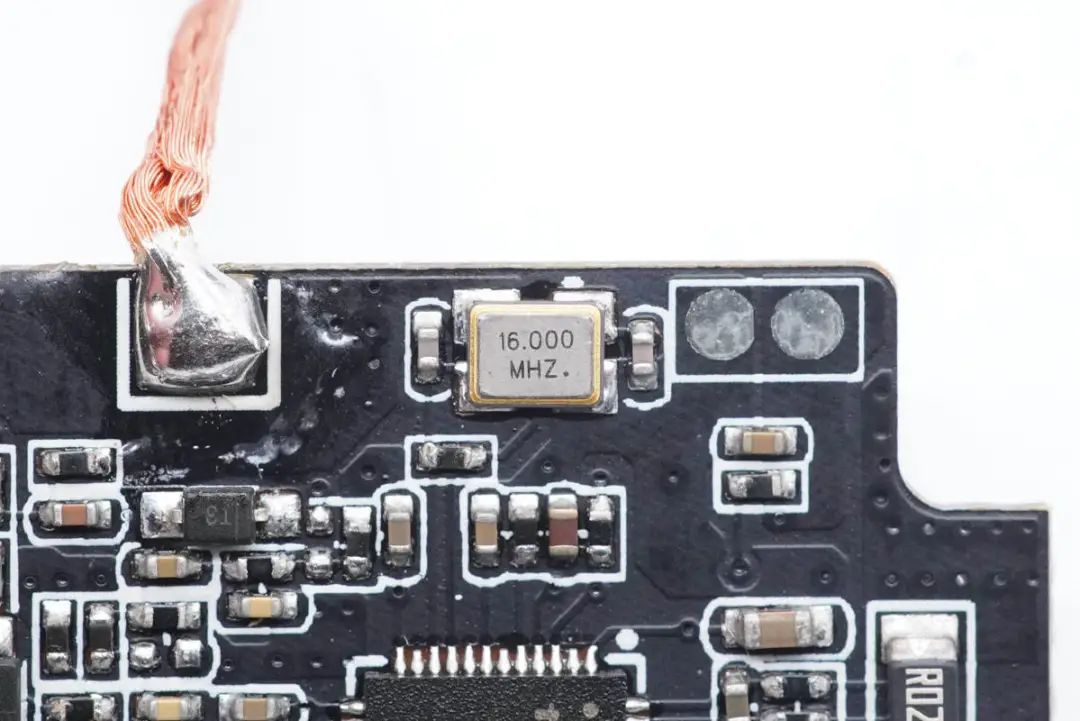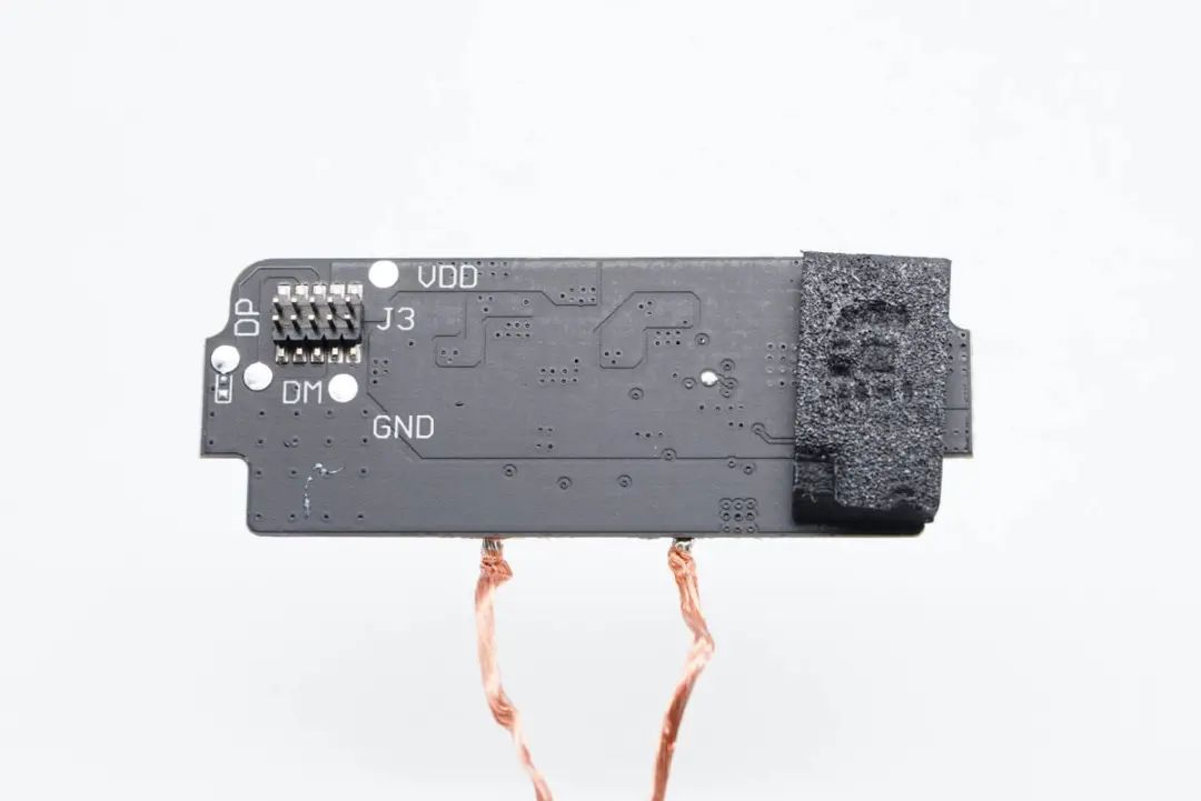 上層小板是無線充電路板,正面設有無線充電發(fā)射芯片、MOS管以及NPO諧振電容,并焊接無線充電線圈。