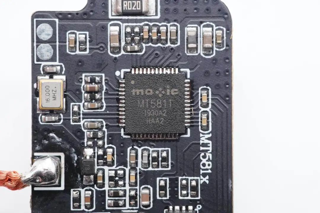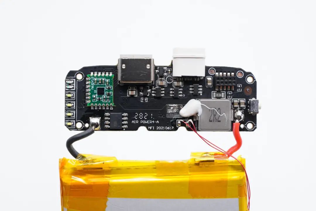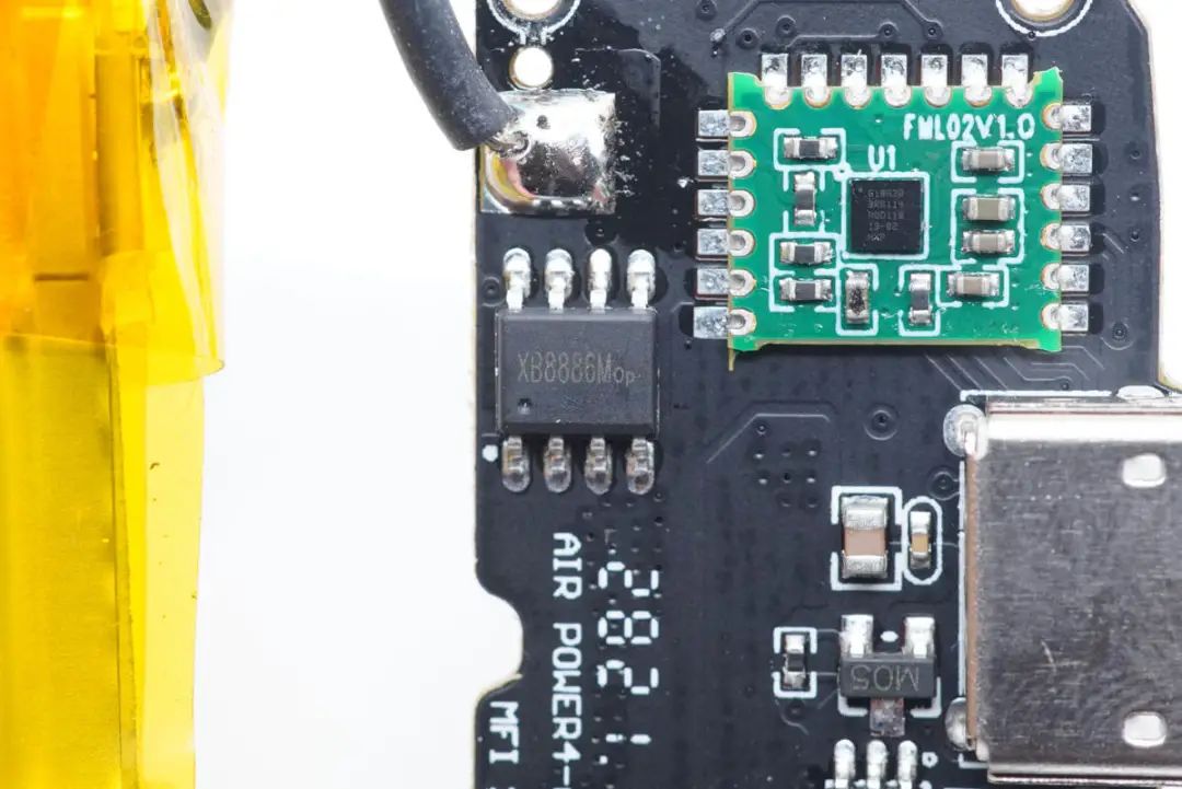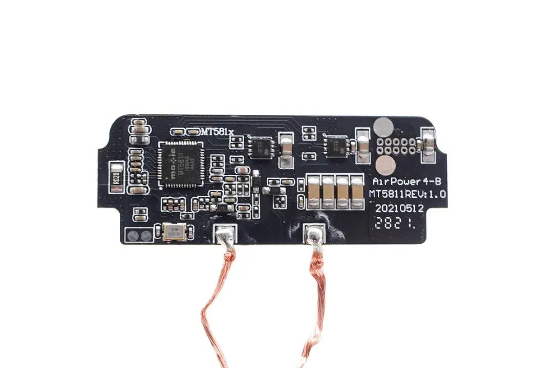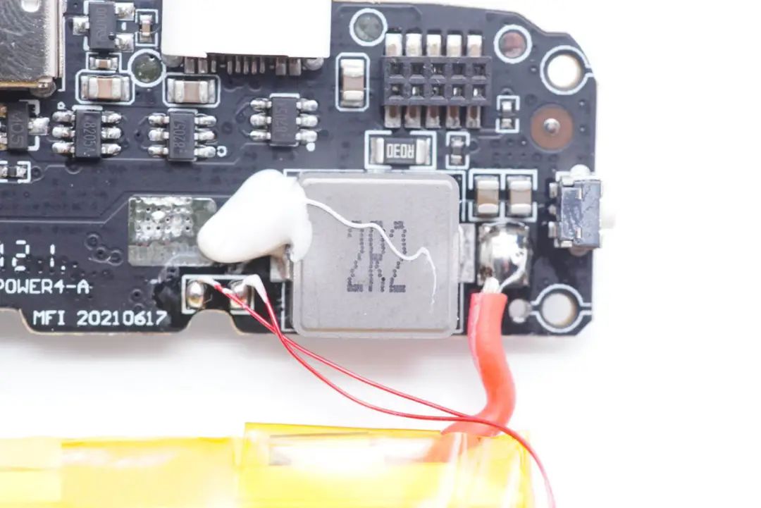 充電頭網(wǎng)通過拆解了解到,充電寶內(nèi)置兩塊PCB小板,之間有泡棉支撐。無線充方案采用美芯晟MT5811,這是一款高度集成的無線充電發(fā)射芯片,符合Qi標準以及高達15/50W的輸出功率,還集成ARM M0 處理器,總的來說在體積、兼容性、性能、效率等方面的表現(xiàn)都很好,能夠滿足客戶的各種要求。