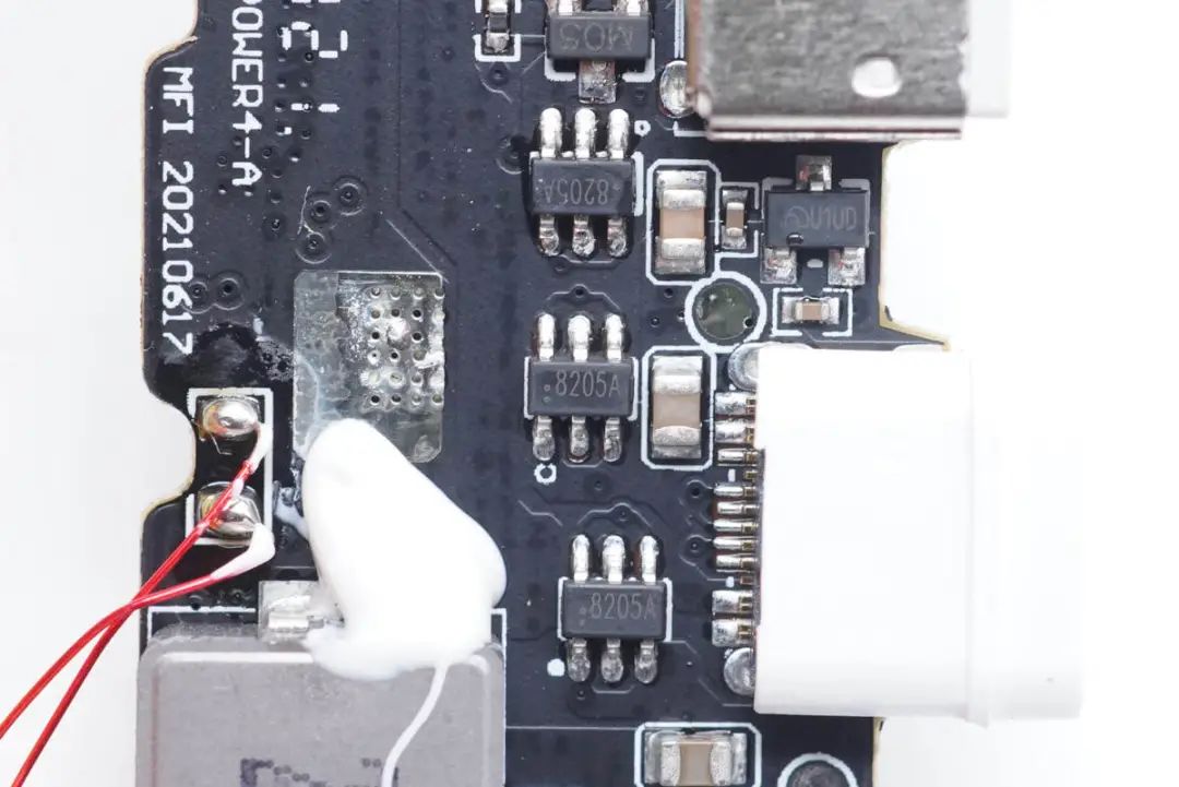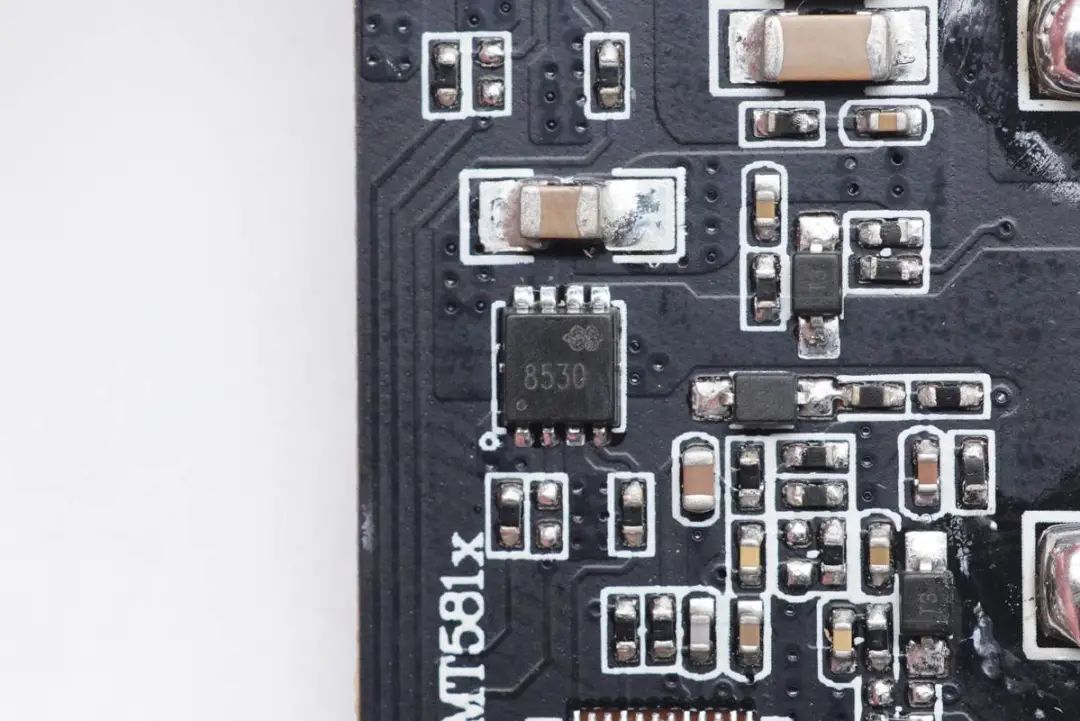 移動電源主控芯片采用智融SW6206。這是一款高集成度的多協(xié)議雙向快充移動電源專用多合一芯片,支持A+A+B+C+L口任意口快充。其集成了5A高效率開關(guān)充電,22.5W高效同步升壓輸出。