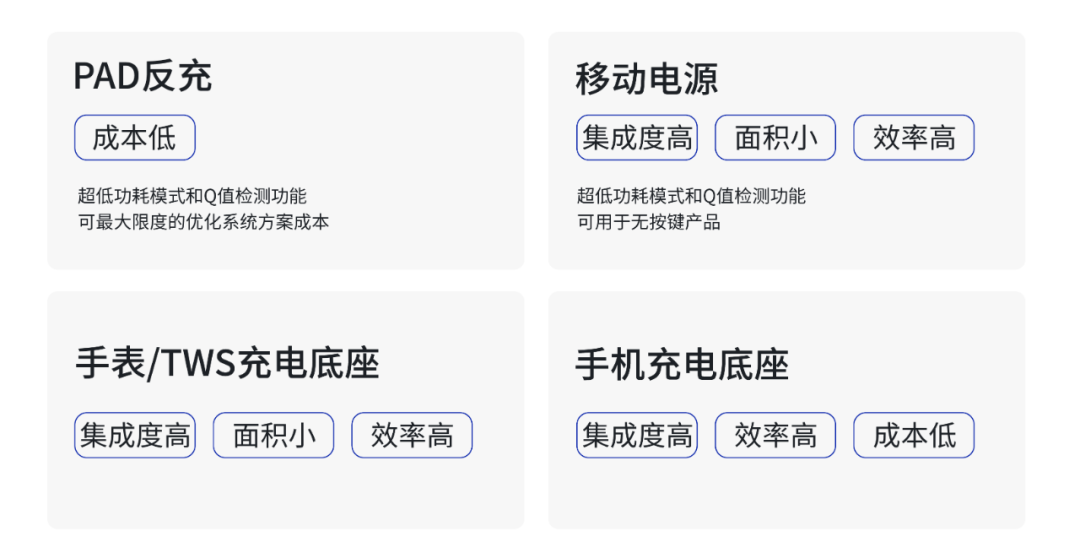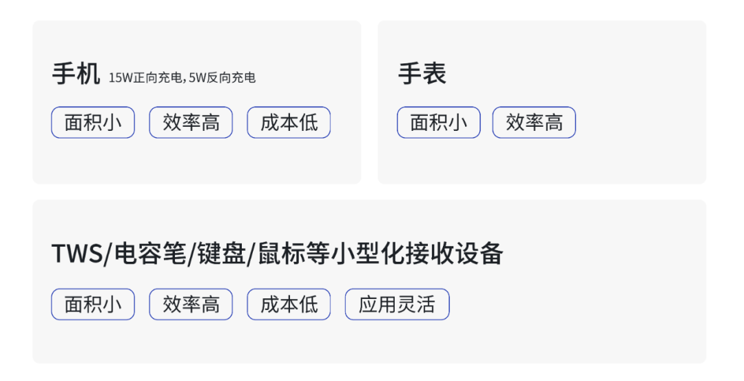美芯晟在無線充電領(lǐng)域深耕數(shù)年,擁有全面覆蓋無線快充電源管理芯片的完整產(chǎn)業(yè)鏈核心技術(shù),關(guān)鍵性能指標達到國際先進水平,產(chǎn)品豐富度在業(yè)內(nèi)領(lǐng)先,可滿足中小功率、大功率、車規(guī)級等不同的終端產(chǎn)品應(yīng)用需求。