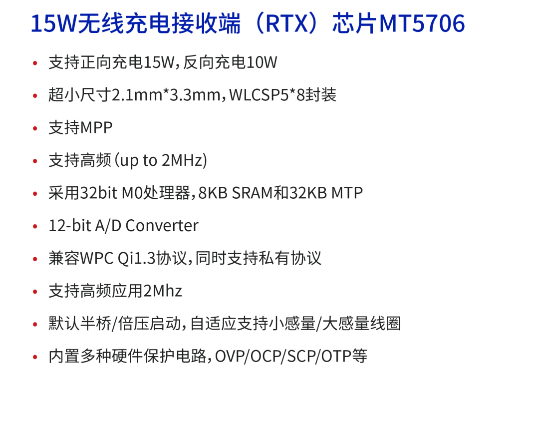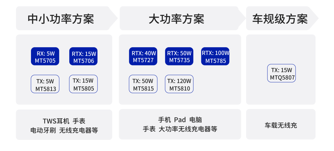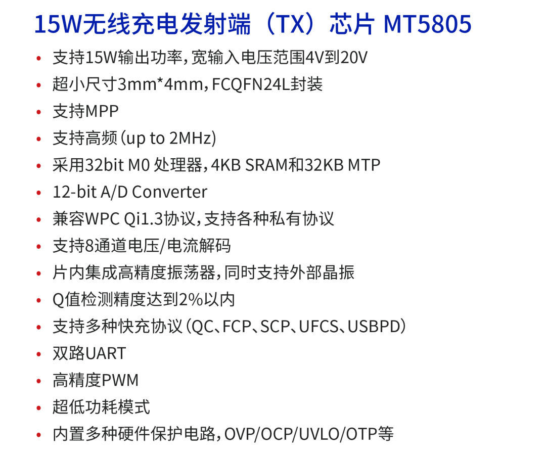 該方案可應(yīng)用于手機、PAD、可穿戴設(shè)備、智能配件、電動牙刷、移動電源、車載支架等中小功率消費電子產(chǎn)品。MT5706+MT5805方案輸出功率可達15W。